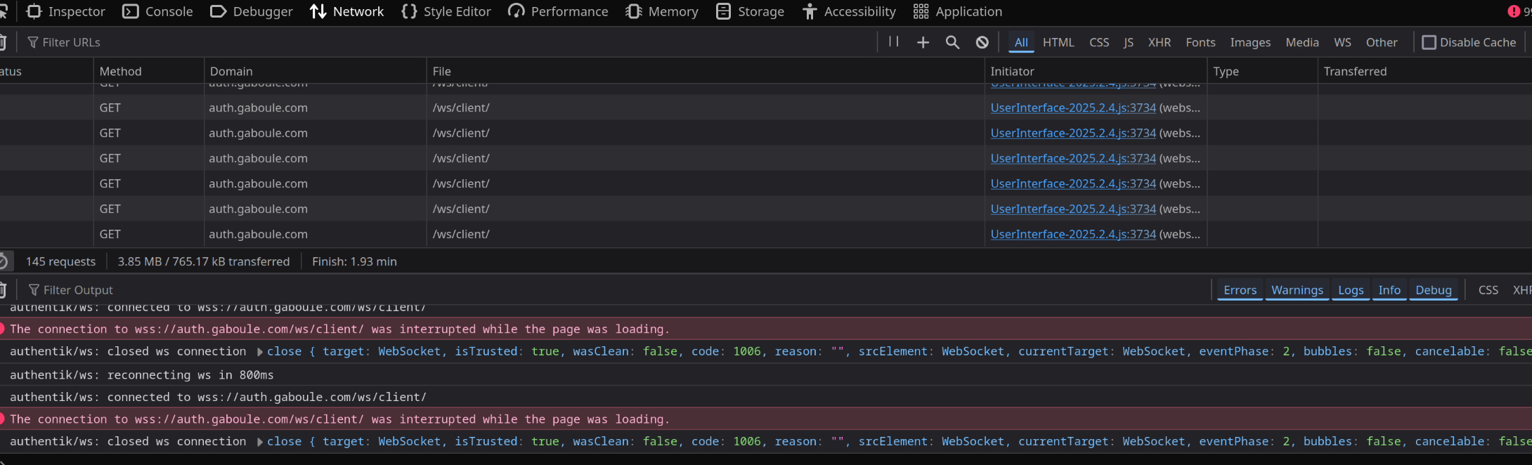 I'm not sure why Authentik uses websockets, as everything works fine without them. If someone has Authentik open in a tab, it might overload the reverse proxy with requests.